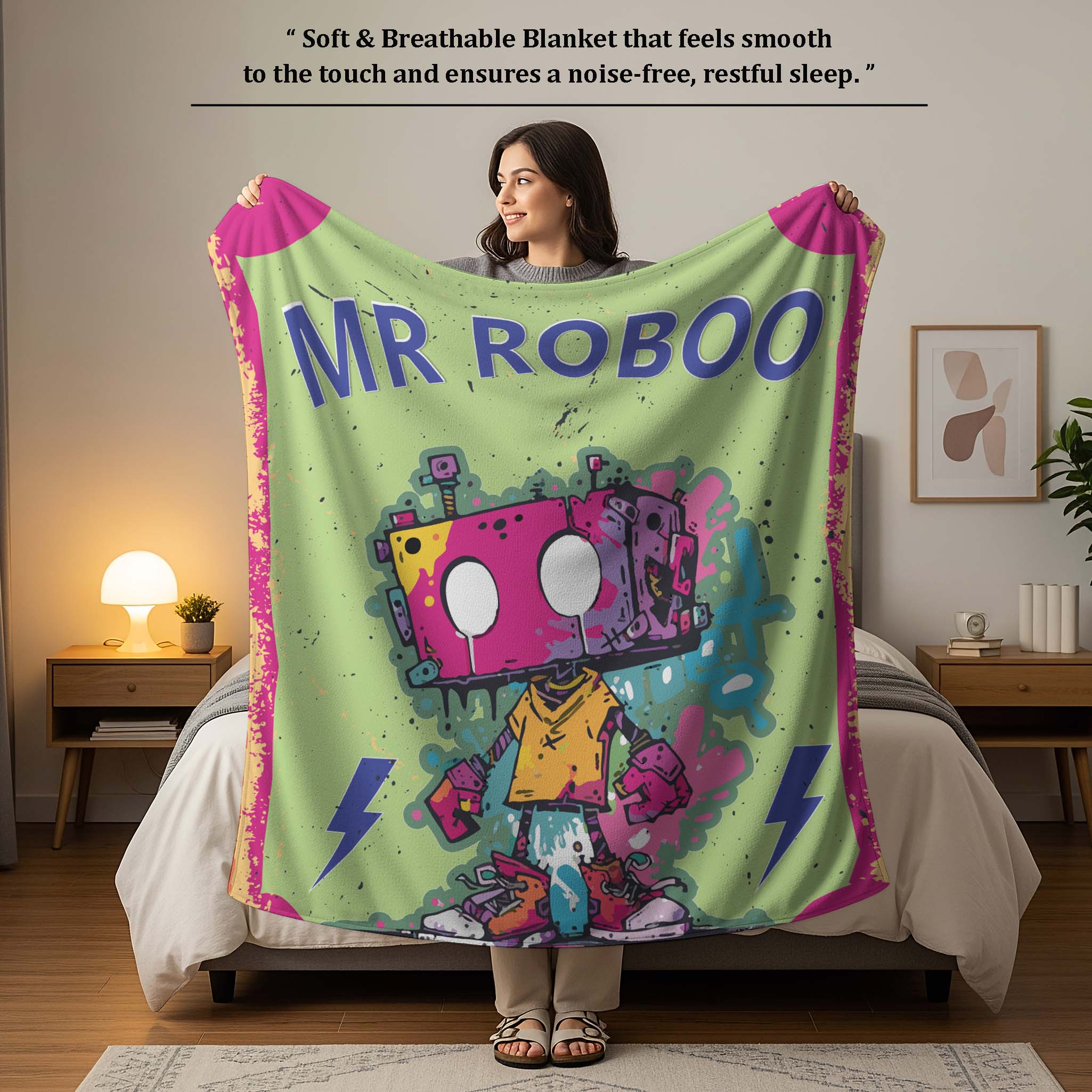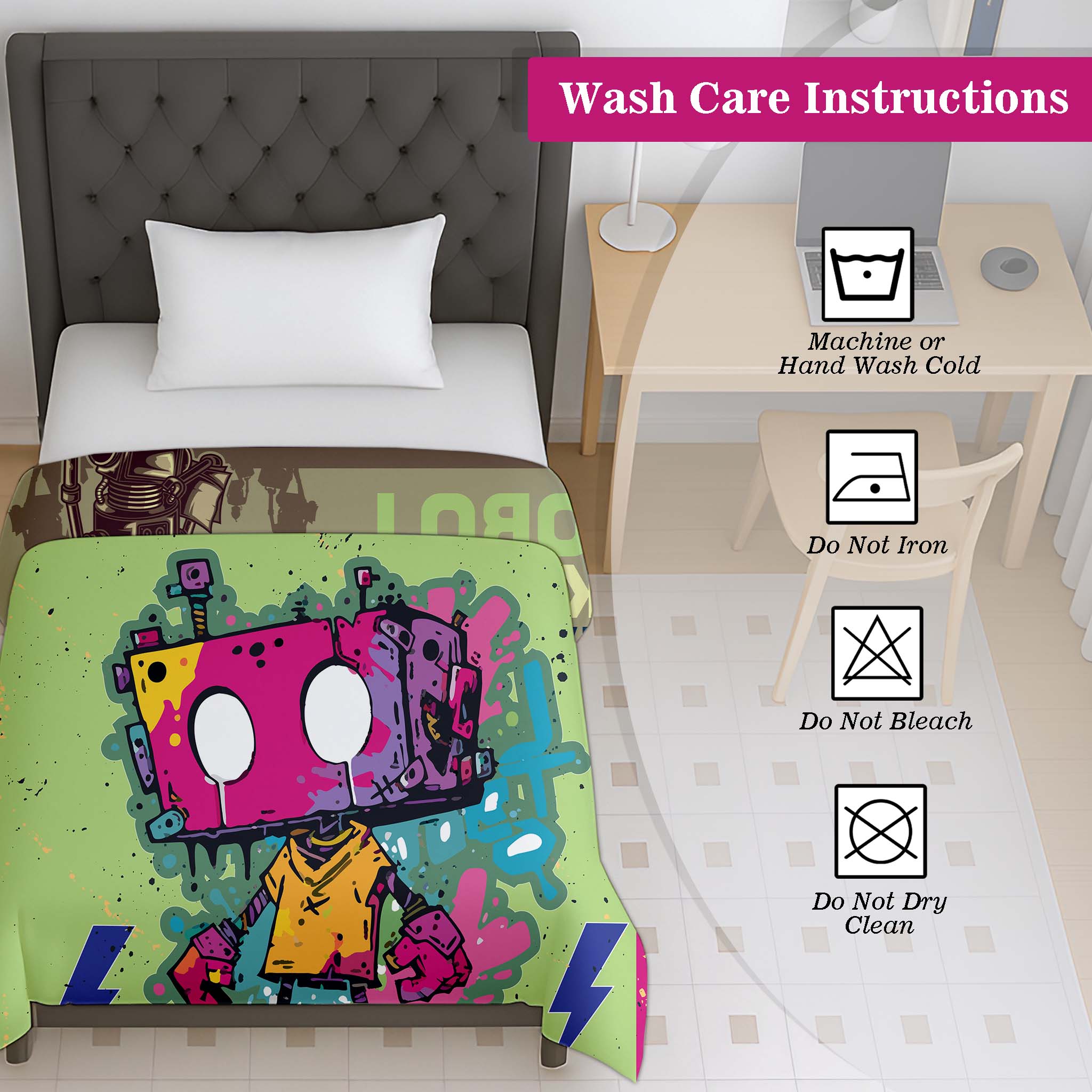 Sized at 39 × 59 inches, this versatile kids blanket can be used as a baby blanket, stroller blanket, travel blanket, nap blanket, or everyday bedding for cribs, cots, and daycare use. Durable and machine washable, the vibrant robot print stays bright even after repeated washing. Jindal Home is a trusted Kids Graffiti Robot Cotton Dohar manufacturer, offering premium children’s bedding products including cotton dohars, baby blankets, and lightweight quilts for retail, wholesale, distributor, and bulk requirements.
