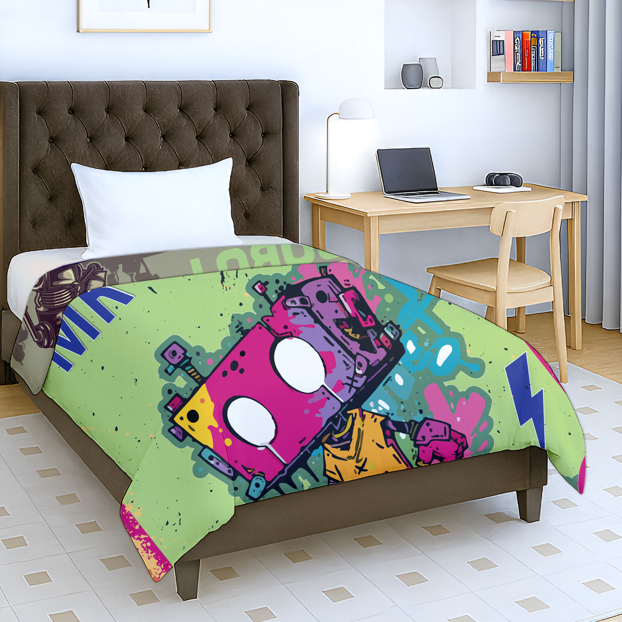 Transform your child’s bedroom into a cheerful and cozy space with the Jindal Home Kids Cotton Dohar featuring a fun Graffiti Robot design . This reversible double-sided kids dohar offers two playful looks in one, allowing you to flip it anytime for a fresh style. Made from soft, lightweight, and breathable cotton, it keeps babies, toddlers, and young kids comfortable throughout the night. The airy fabric promotes proper airflow, making it an ideal summer and AC blanket that provides gentle warmth without overheating.