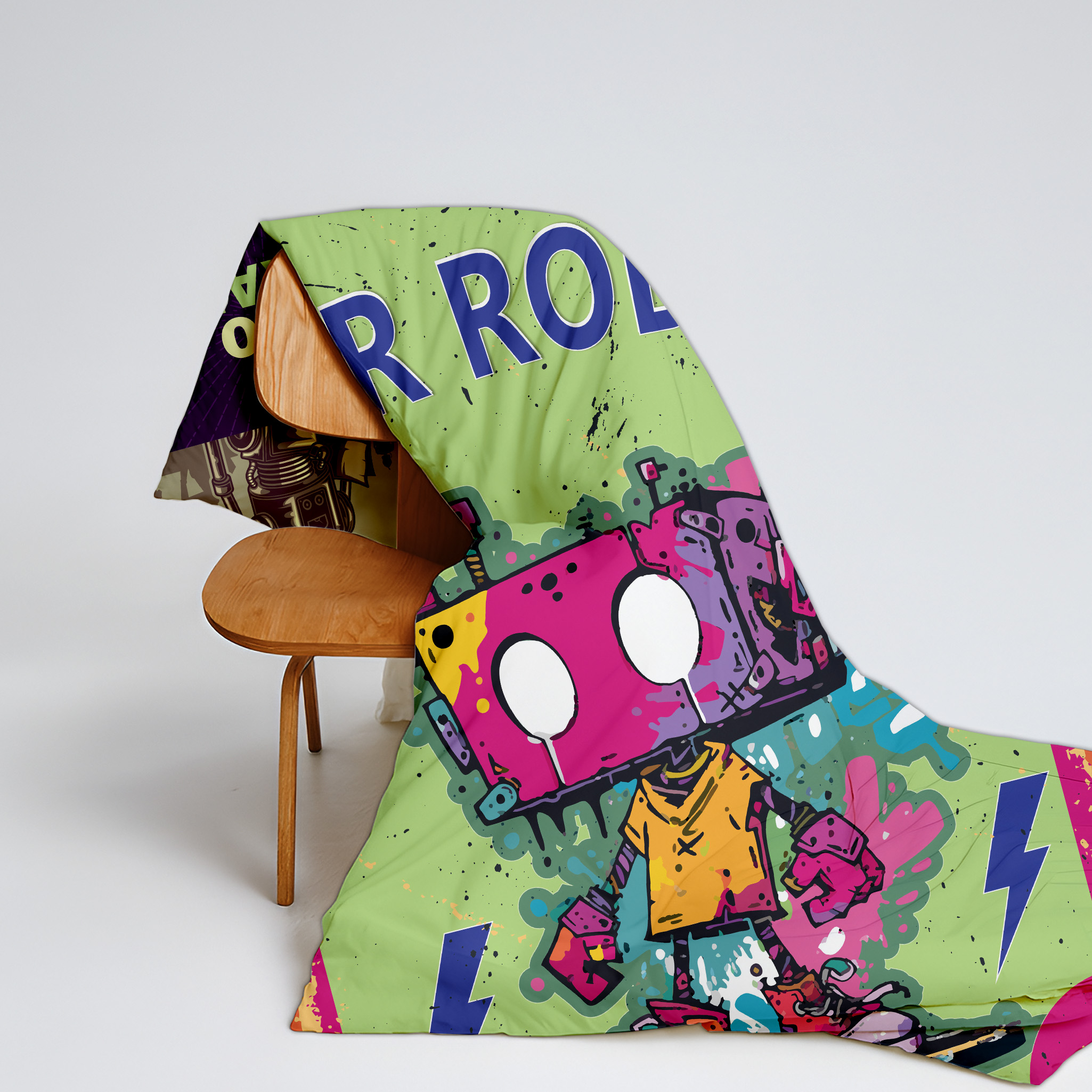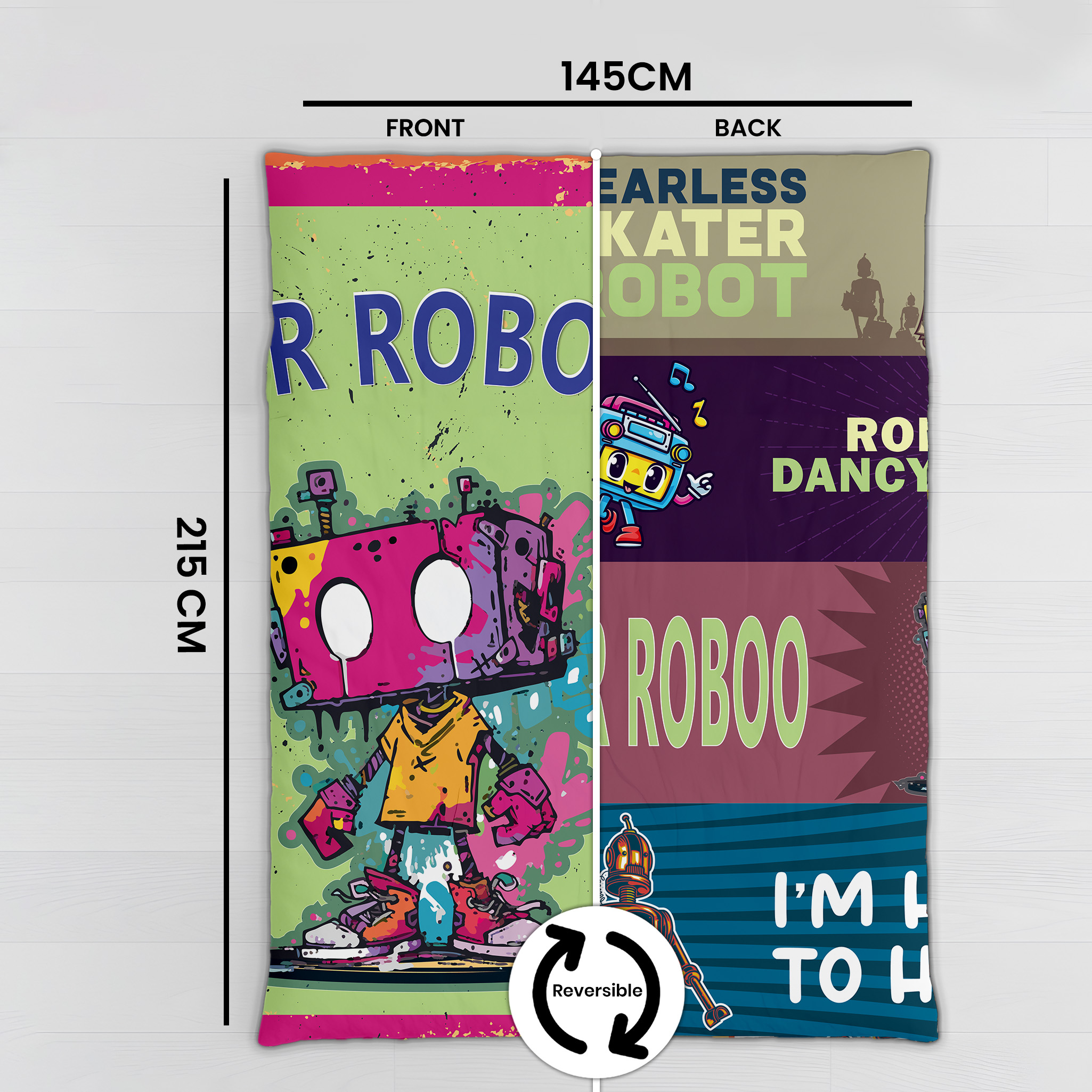 This colorful kids dohar features a fun cartoon robot design with a reversible 2-in-1 pattern, adding a playful touch while offering two stylish looks in one blanket.