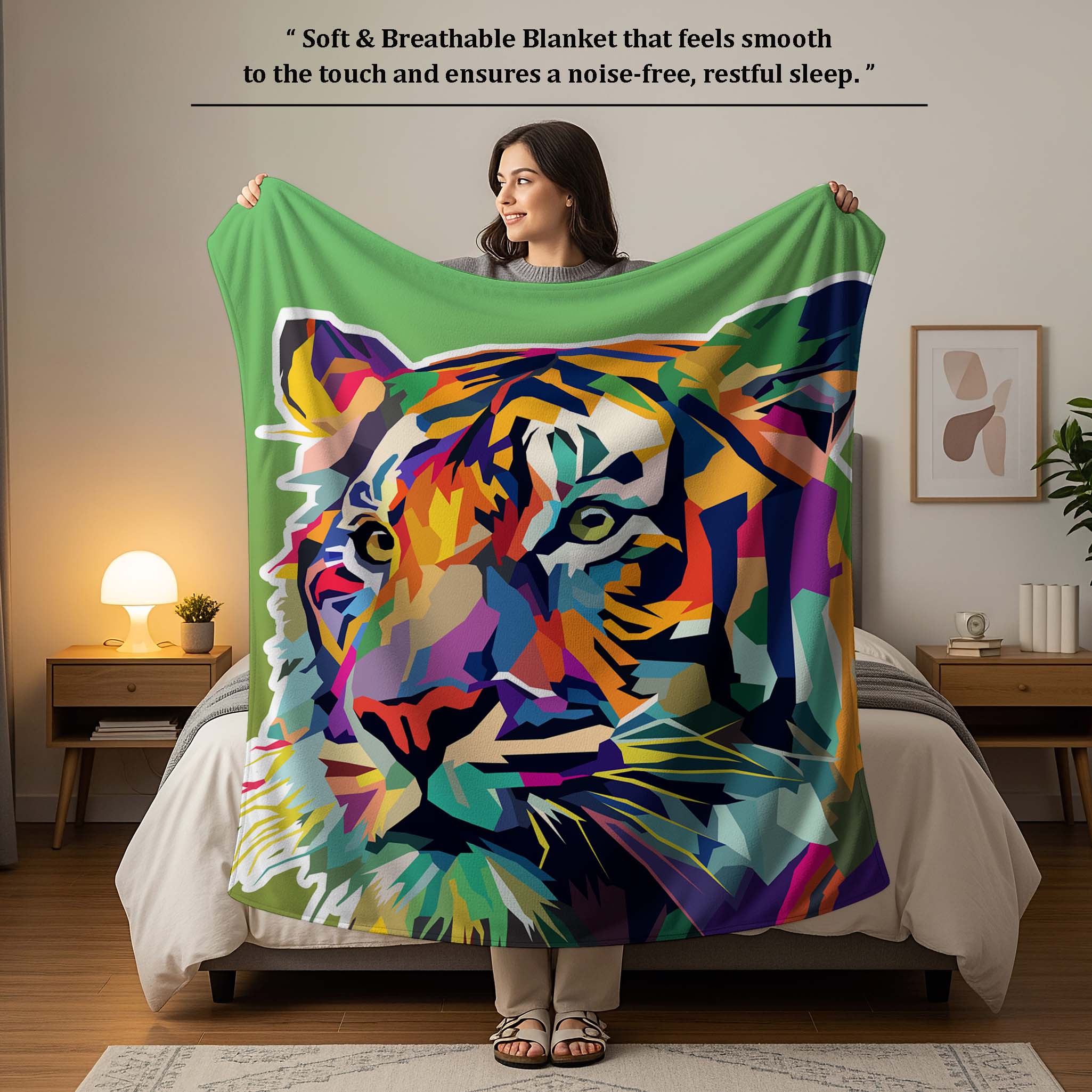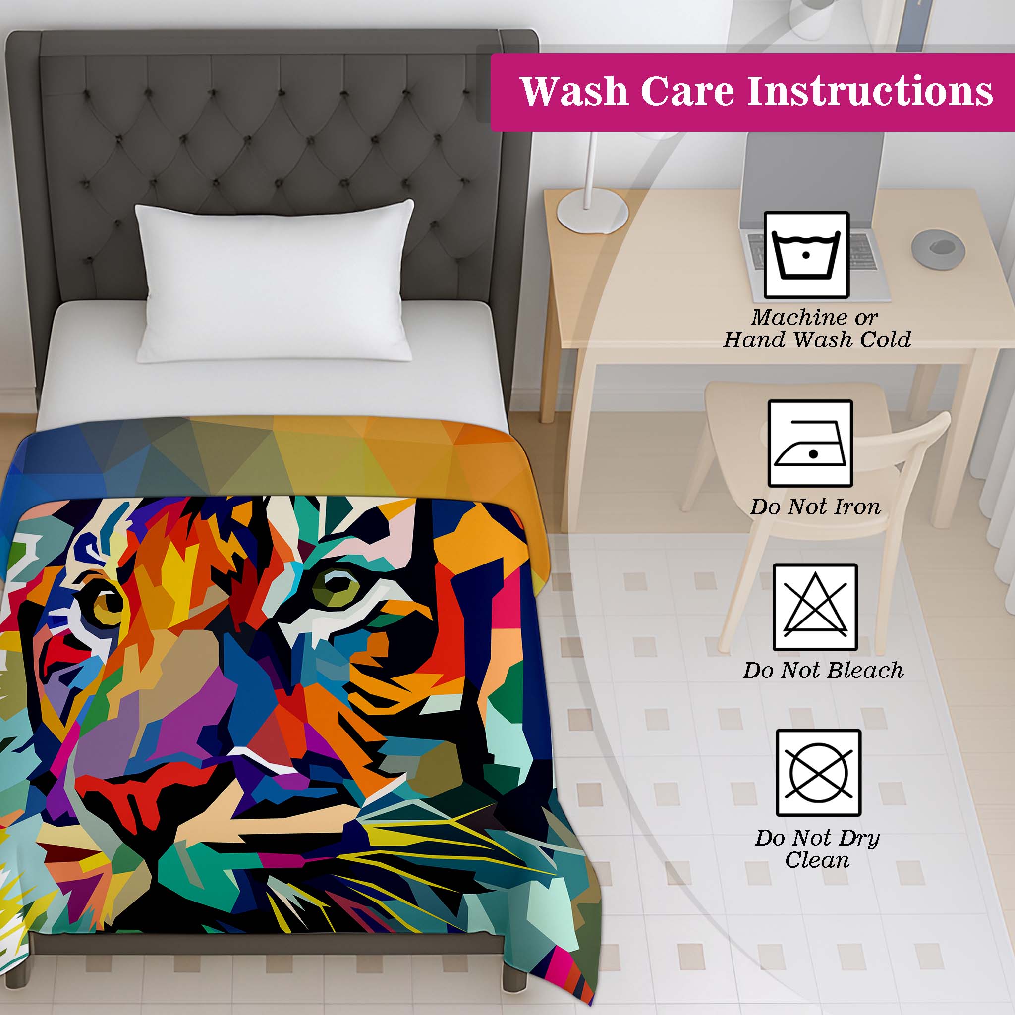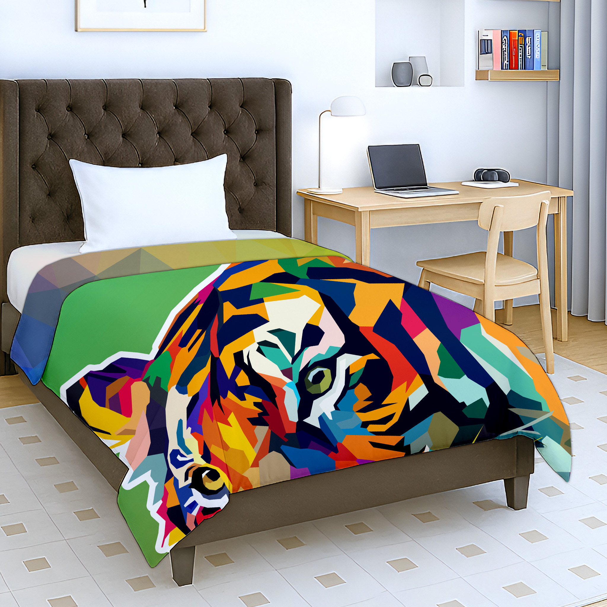 Brighten up your child’s bedroom with the Jindal Home Vibrant Tiger Print Kids Dohar, featuring a bold and colorful artistic tiger design that adds a fun and energetic touch to kids’ bedding . The reversible 2-in-1 double-sided pattern offers two attractive looks in one blanket, allowing you to flip it anytime for a fresh new style.