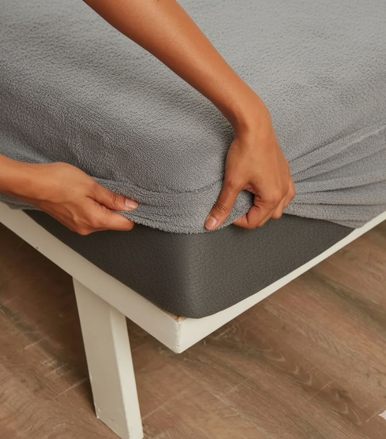 Our *Terry Dyed Mattress Protector* is crafted with high-quality cotton terry laminated fabric, designed to keep your mattress fresh, clean, and long-lasting. The top terry surface ensures softness and comfort, while the TPU lamination at the back provides 100% waterproof protection without any noise or discomfort.